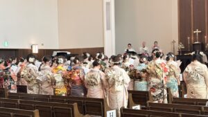新しい年2026年を迎え、清々しく澄んだ空が広がる1月12日(月・祝) 。清心館において、『はたちの感謝礼拝』がもたれました。高校卒業から2年、久々に会った友や恩師と晴れ姿で挨拶を交わす笑顔があちらこちらにあり、とても嬉しく思いました。